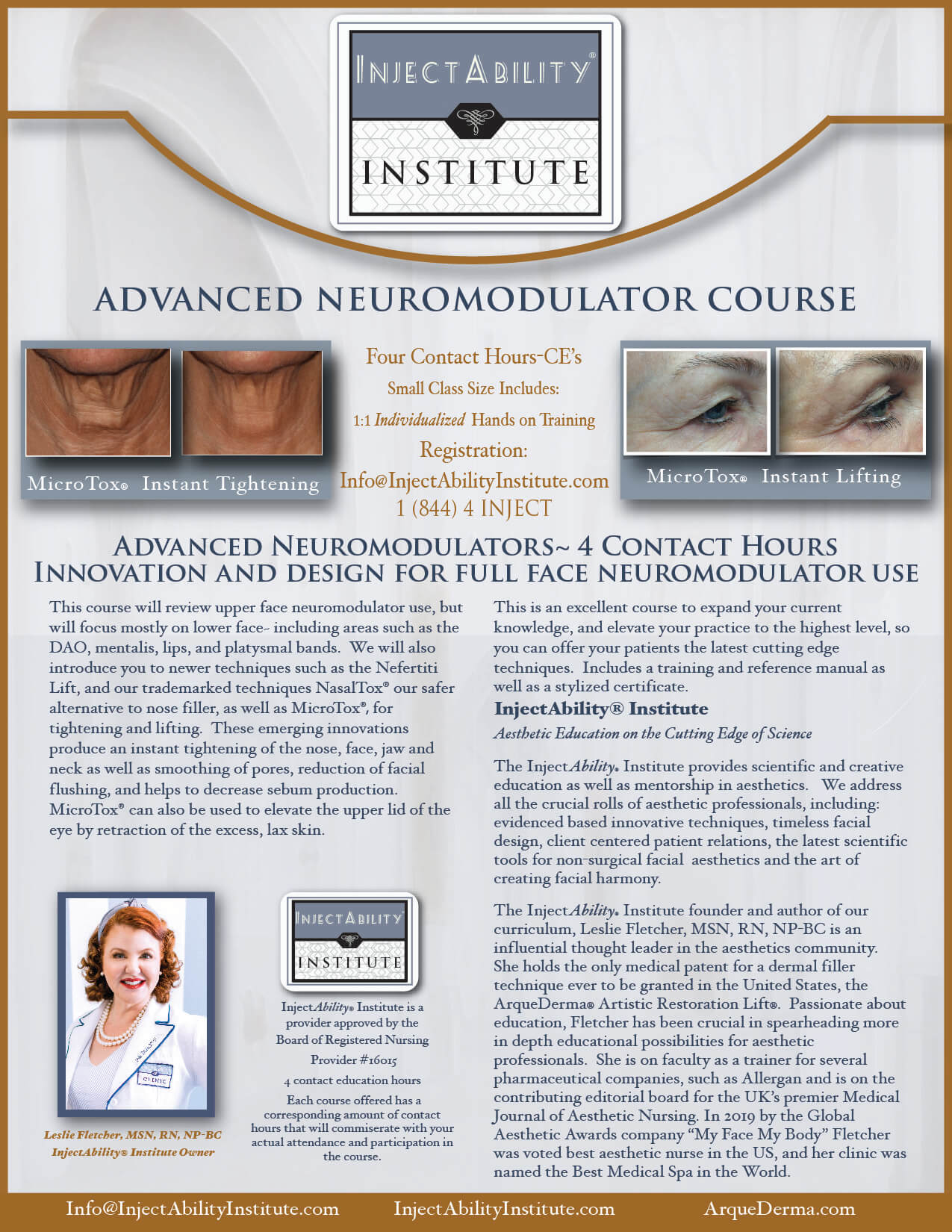 In this class we will review upper face treatment with neuromodulators, but will spend the majority of time on lower face (DAO, mentalis, lips, Nefertiti lift, neck bands, neck wattle, rhinomodulation, and our exclusive technique MicroTox®) for instantaneous treatment of skin deterioration, facial flushing, and diminish pore size. Includes a Training and Reference Manual, as well as a stylized certificate. InjectAbility® Institute is a Provider Approved by the California Board of Registered Nursing, Provider # 16015, for six (6) Contact Hours (U.S. courses only).