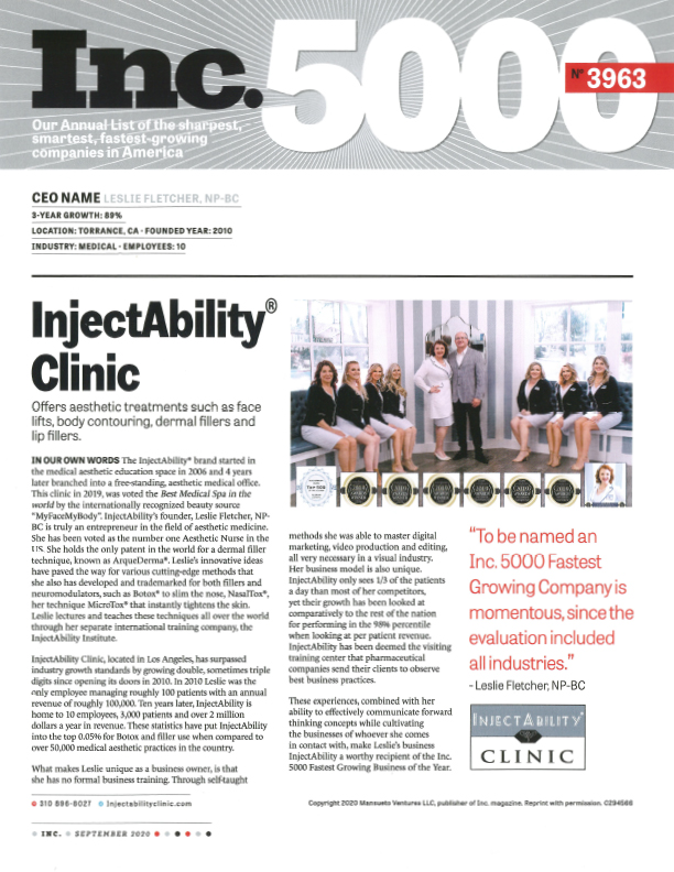 Injectability Clinic featured in INC. 5000 as Number 3963. Leslie Fletcher featured and quoted. September 2020