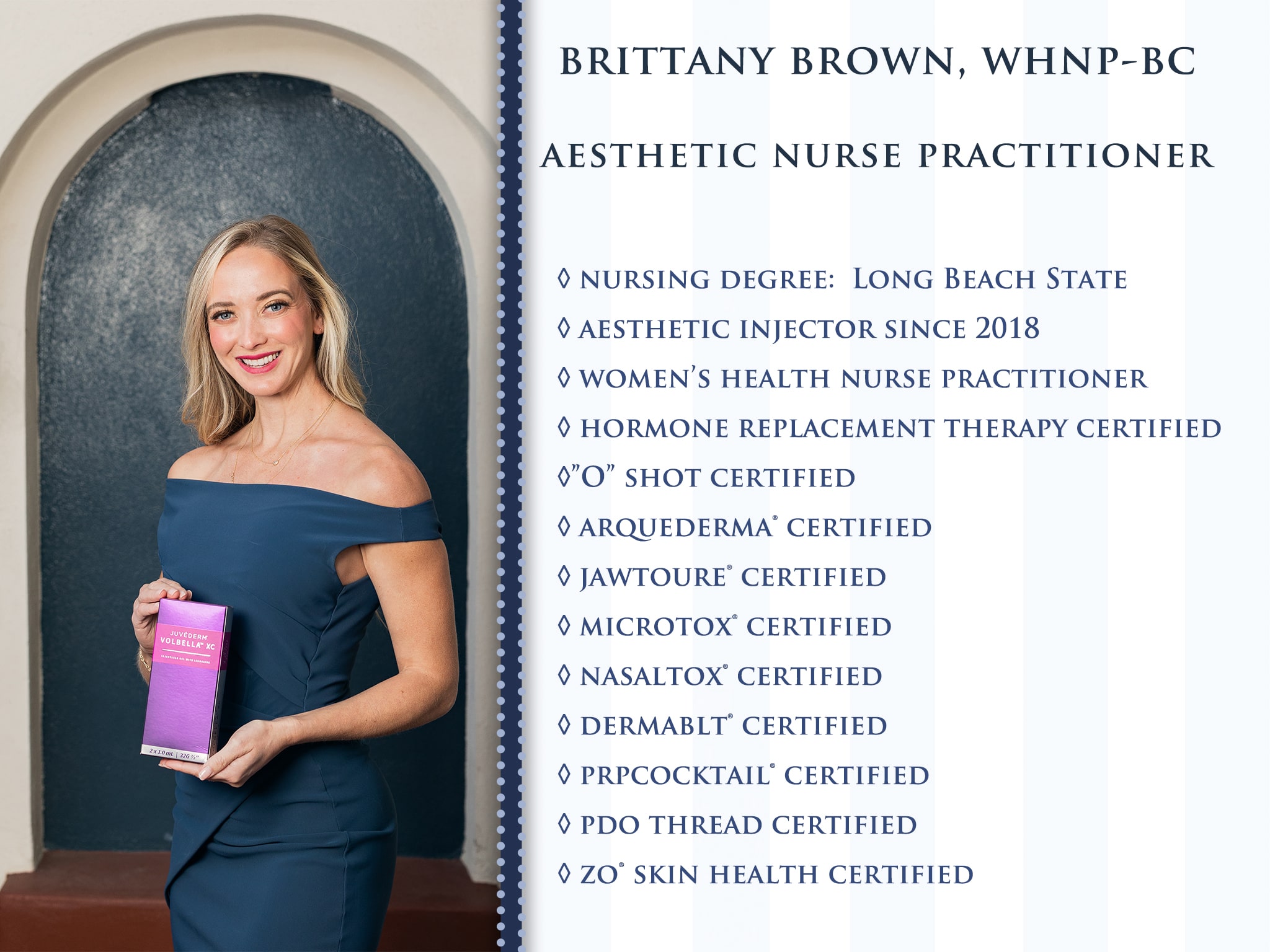 Our Director of Nursing, Leslie, met her at her other office years ago when training on aesthetic treatments for their patients. Leslie fell in love with Brittany’s kind, bed side manner, and pursued her as a potential add on to our clinic. Brittany continued to take courses from InjectAbility where she shined amongst the students. She is a great addition to our practitioners and staff.